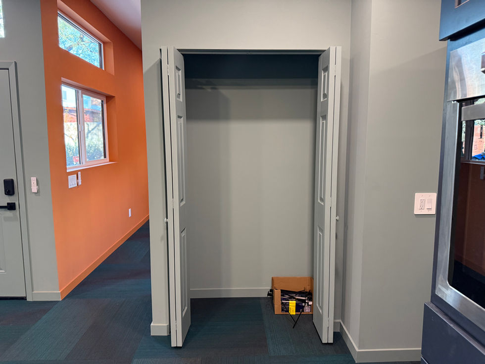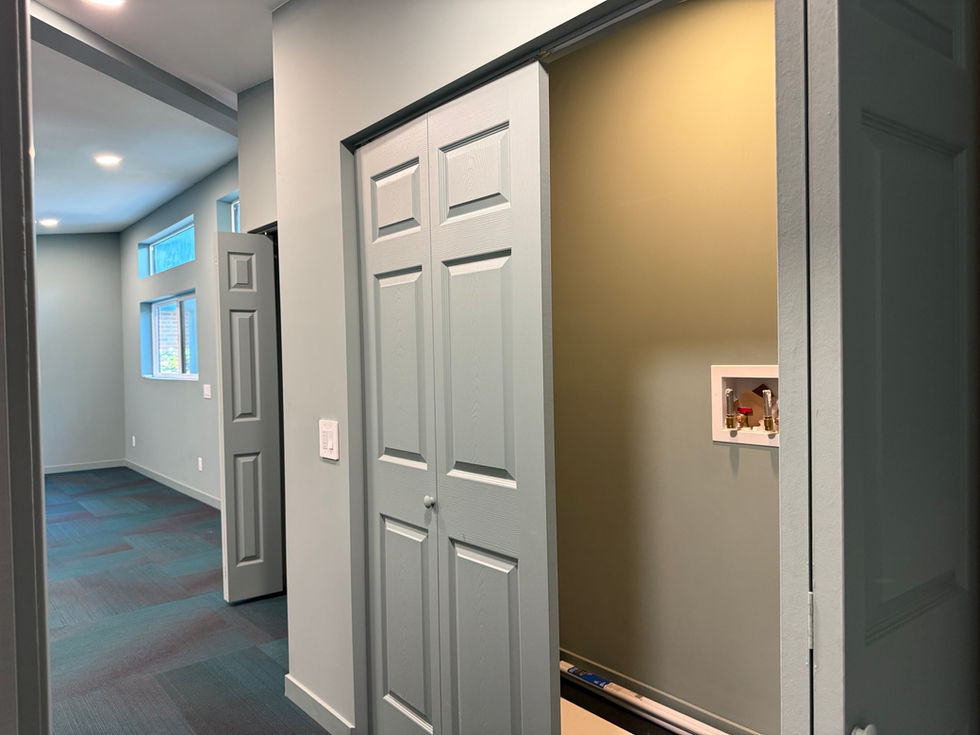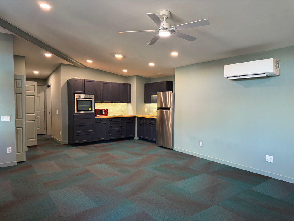 To suit these creative and accessibility needs, we converted the original two-bedroom plan into a large single bedroom. This spacious, open area provides ample room for sleeping, living, and showcasing the art collection. The open floor plan also allows the kitchen and living room to flow together, making the home feel more spacious and efficient.